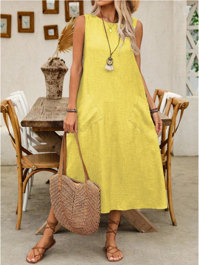 This is the epitome of fast-fashion filler—a nondescript, solid-color sack dress masquerading as a “casual” staple. The fabric will be a thin, limp synthetic that offers no shape or structure, ensuring it clings in unflattering ways. The pockets, instead of being a thoughtful detail, will sag and distort the already boxy silhouette.