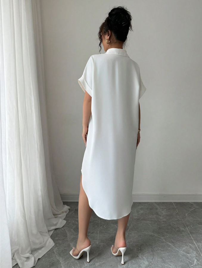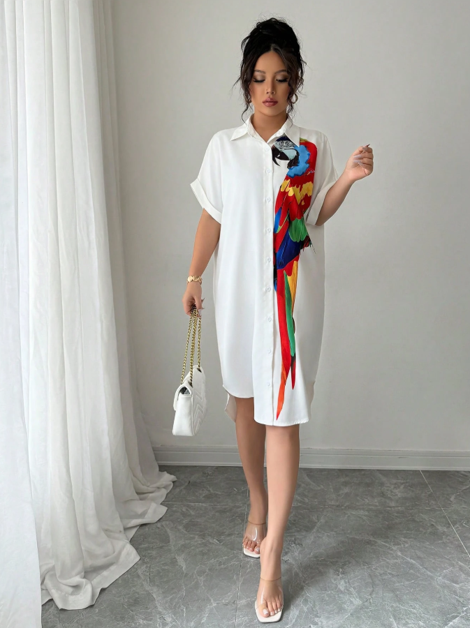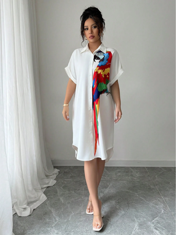 The Chiquease Vacation Casual Parrot Print Batwing Sleeve Button Front Shirt Dress brings a playful tropical vibe to warm-weather getaways with its vibrant parrot motif and breezy, relaxed silhouette. The flowing batwing sleeves add a touch of dramatic flair while ensuring comfort and movement, perfect for exploring exotic destinations or lounging poolside in style. Its versatile button-front design allows you to wear it as a lightweight dress or open as a cover-up, making this cheerful printed piece a fun and functional addition to any vacation wardrobe.