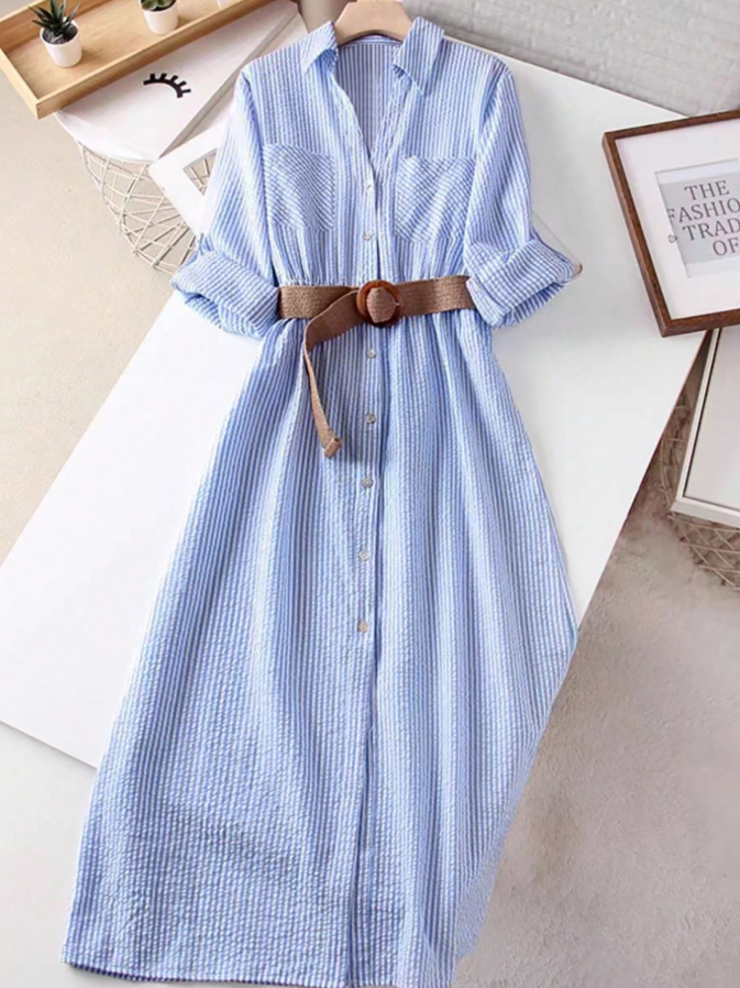 The Franclia Women’s Striped Long Sleeve Single-Breasted Pocket Casual Long Shirt Dress is the ultimate blend of classic style and everyday comfort, perfect for university life and fall layering. The timeless striped pattern and single-breasted button-front design offer a polished yet relaxed aesthetic, while the functional pockets add practicality for campus essentials or weekend errands.