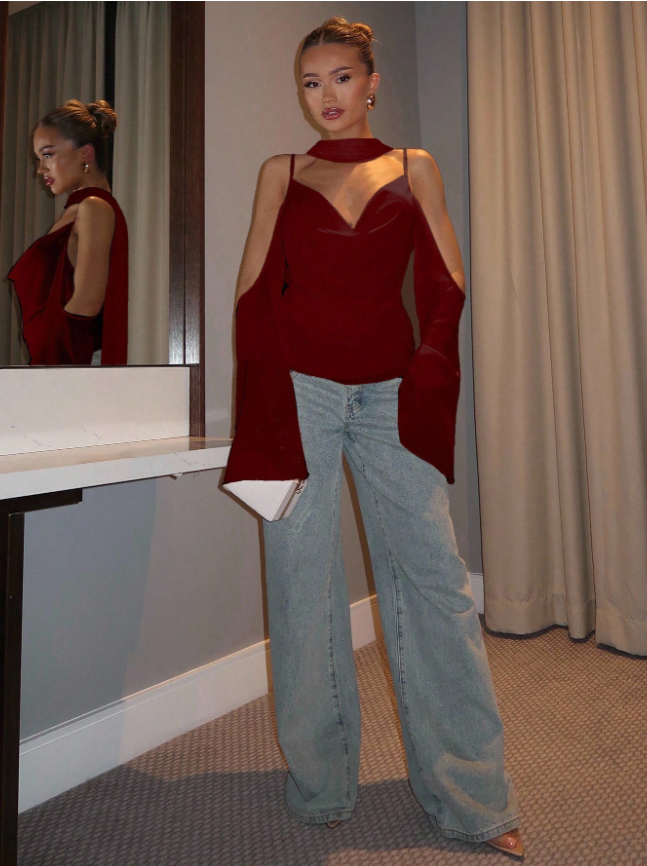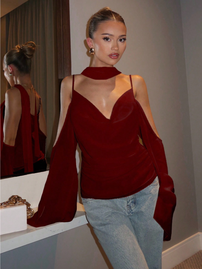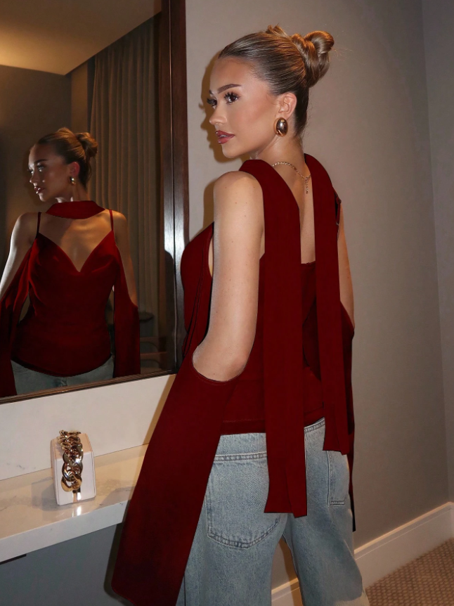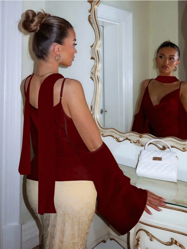 Modern tasarımın zamansız çekicilikle buluştuğu Glamine Choker Neck Top ile tüm dikkatleri üzerinize çekin. Bu bordo askılı bluz, dekolteyi zarif bir şekilde çerçeveleyen entegre bir choker yakası, cesur bir omuz dekoltesi ve sırtı açık tasarımıyla iddialı bir görünüm sunmak üzere tasarlandı. Zarif büzgüler ve ince bir yırtmaç detayıyla zenginleştirilmiş, ustaca drapelenmiş ön kısım, büyüleyici bir doku ve silüet oyunu yaratırken, zahmetsizce akan, vücuda oturan bir kesim sunuyor.