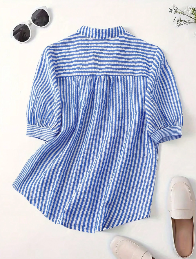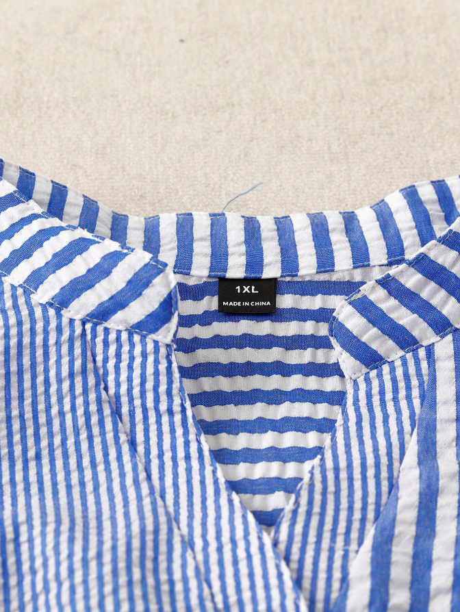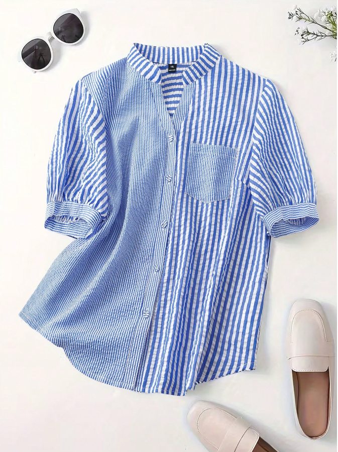 Embrace effortless style with this GlowEve CURVE plus size short sleeve shirt, featuring a vibrant contrast color striped print and eye-catching patchwork design. The full button front allows for versatile styling, while the practical front pockets add both function and fashion-forward flair. Crafted from breathable, comfortable fabric, it offers a relaxed fit that flatters curves without sacrificing ease of movement. This essential casual piece pairs perfectly with jeans or trousers for a polished yet laid-back look.
