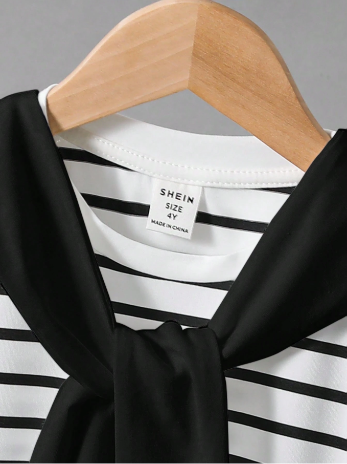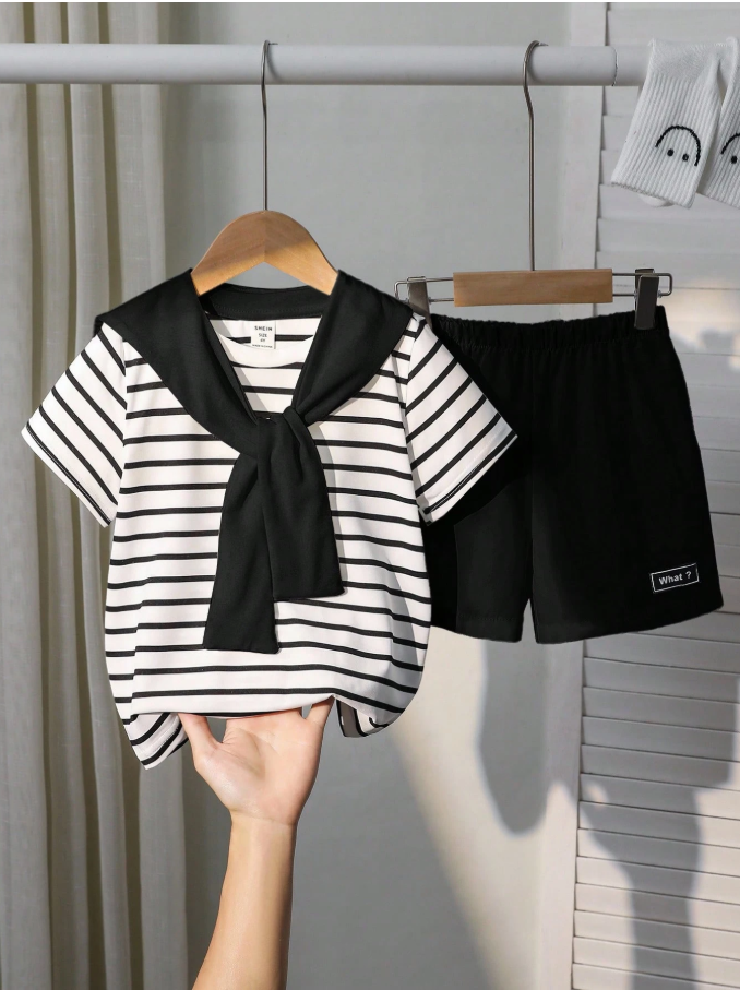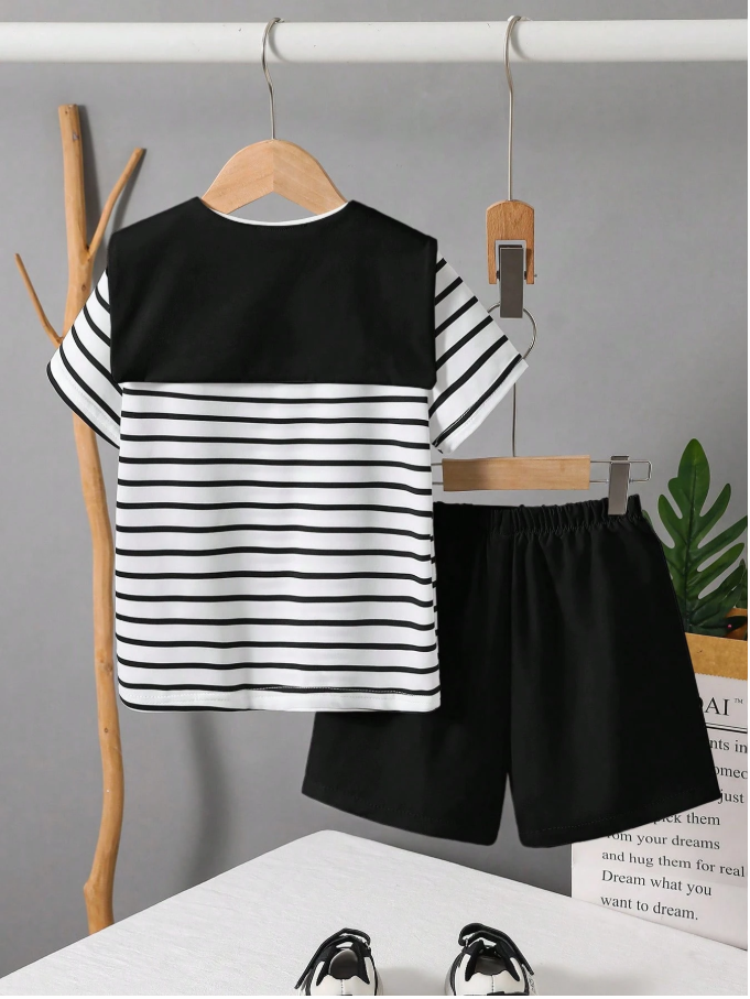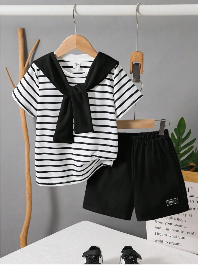 SHEIN 2 Parça Takım Genç Erkek Çocuklar İçin Günlük Spor Kolej Edebiyat Retro Kıyafet, modern genç erkek çocuklar için tasarlanmış şık ve rahat bir giyim setidir. Klasik siyah-beyaz çizgili yuvarlak yakalı tişört, temiz beyaz şort ve modaya uygun şal tarzı bir süslemeyle tamamlanan bu kıyafet, sportif, retro ve kolej esintili modanın eşsiz bir karışımını sunar. Yumuşak, nefes alabilen kumaştan üretilmiş ve rahat bir kesime sahip olan bu set, aktif oyun ve günlük giyim için gün boyu konfor sağlar.