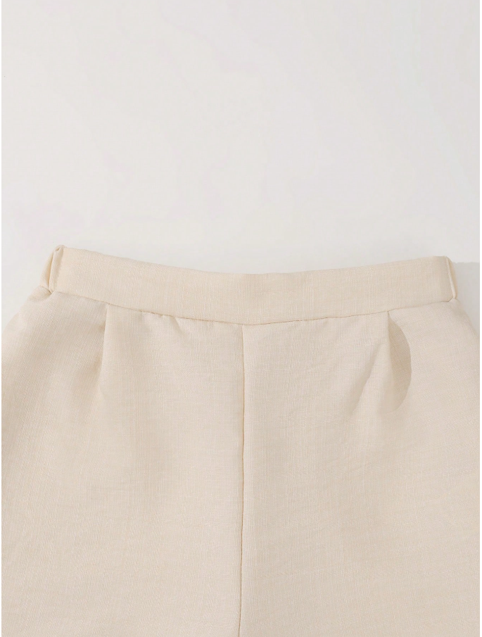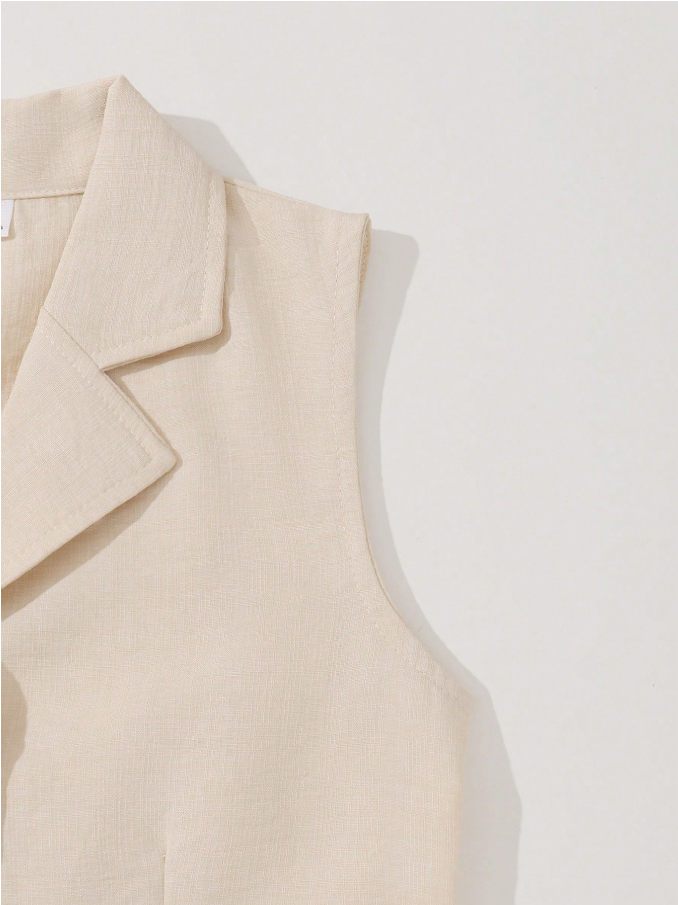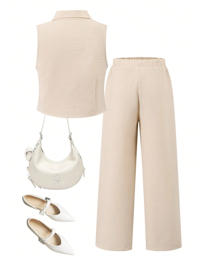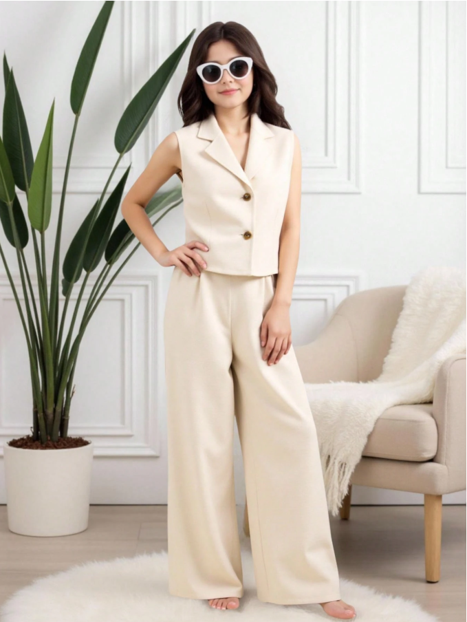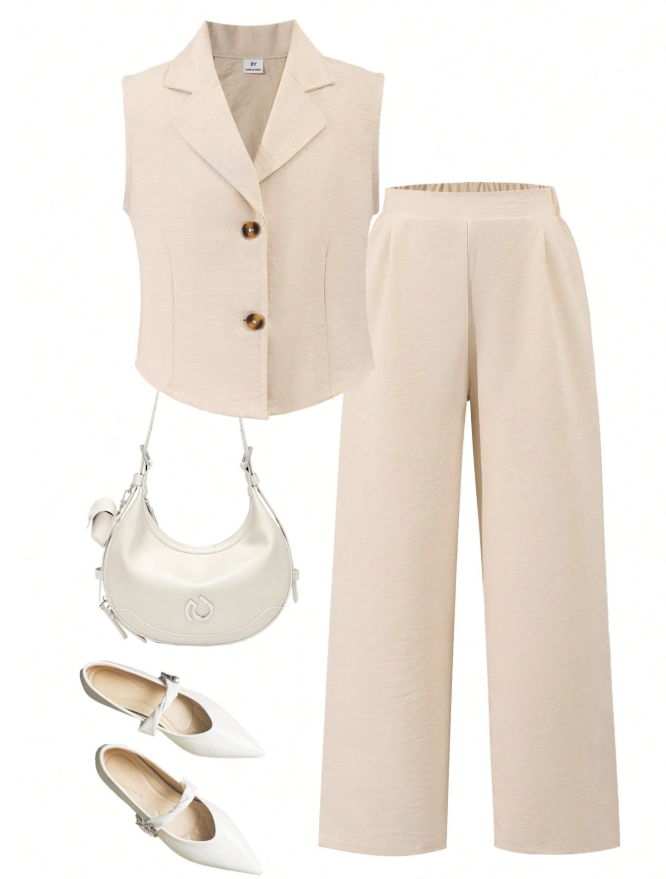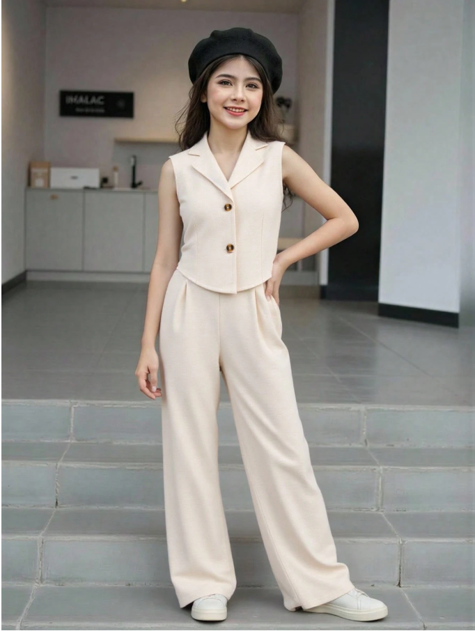 SHEIN 2 Parça/Set Kız Çocuk Şehir İçi Giyim Bej Yelek ve Pantolon Takımı, şık ve modern bir görünüm için tasarlanmış, rahat bir günlük kıyafet setidir. Bu şık set, klasik yakalı ve iki düğmeli ön kısmı olan kolsuz kısa bir yelekten oluşarak zarif ve minimalist bir görünüm yaratır. Yüksek bel geniş paçalı pantolonla kombinlenen tasarım, hareket özgürlüğü ve gün boyu konfor sağlarken, vücuda oturan bir silüet sunar.