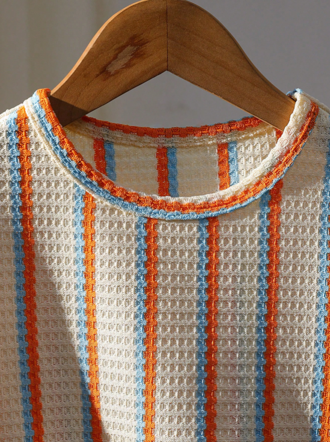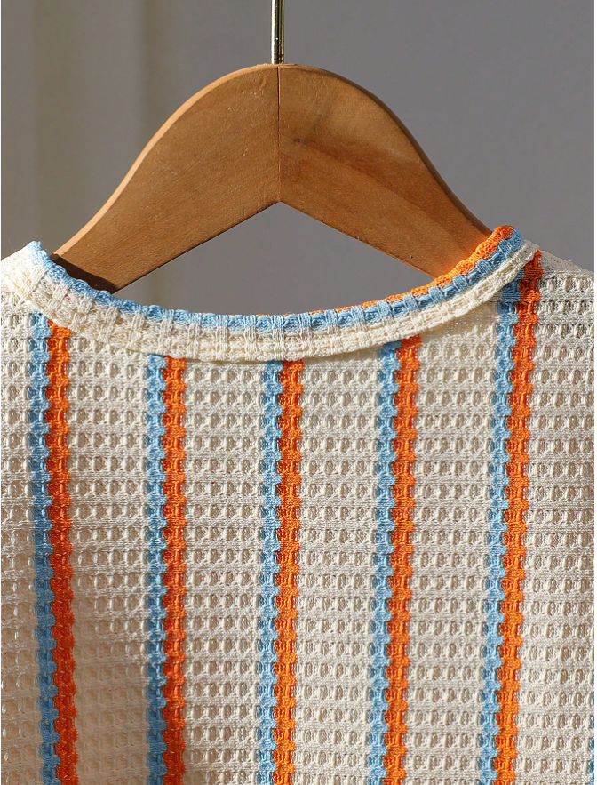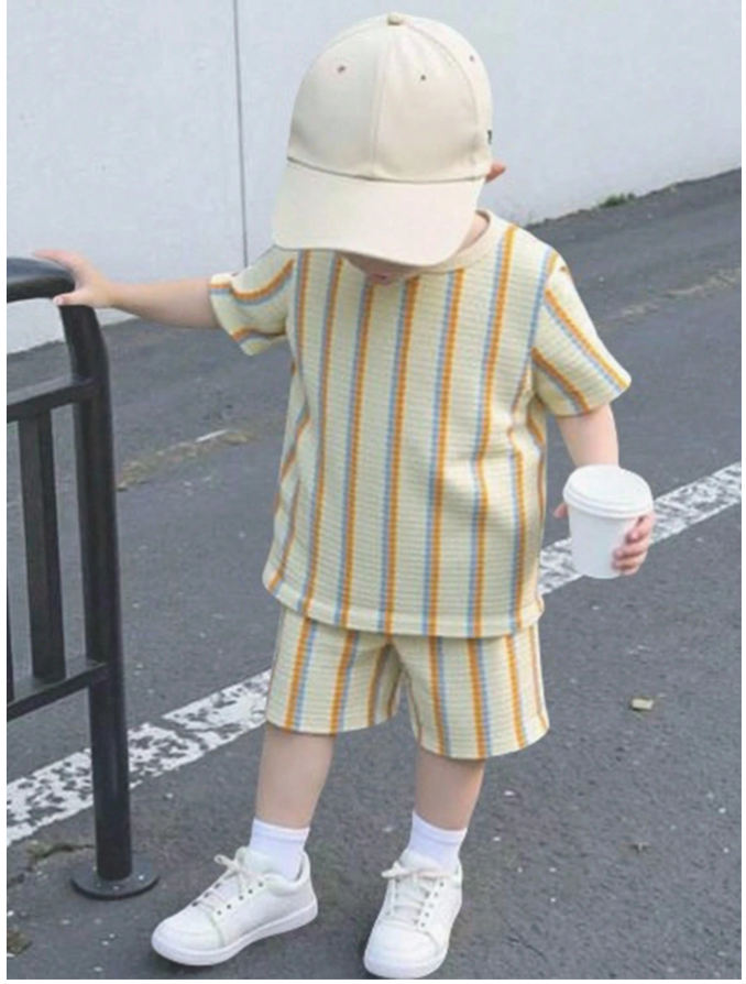 SHEIN Genkimix Çocuk 2 Parça/Set Genç Erkek Çocuk Yazlık Waffle Çizgili Kısa Kollu Tişört ve Şort Takımı, sıcak havalarda eğlence ve rahatlama için tasarlanmış, konforlu ve şık bir kıyafettir. Yumuşak waffle dokulu çizgili kısa kollu tişört ve ona uygun hafif şorttan oluşan bu set, ferah, uyumlu ve rahat bir yaz görünümü sunar. Nefes alabilen kumaştan ve rahat kesimden üretilen bu set, aktif erkek çocuklar için kolay hareket ve tüm gün konfor sağlar. Yaz tatilleri, plaj gezileri, seyahat, açık hava oyunları ve günlük kullanım için mükemmel olan bu çok yönlü iki parçalı set, pratikliği zahmetsiz mevsimsel stille birleştirir.