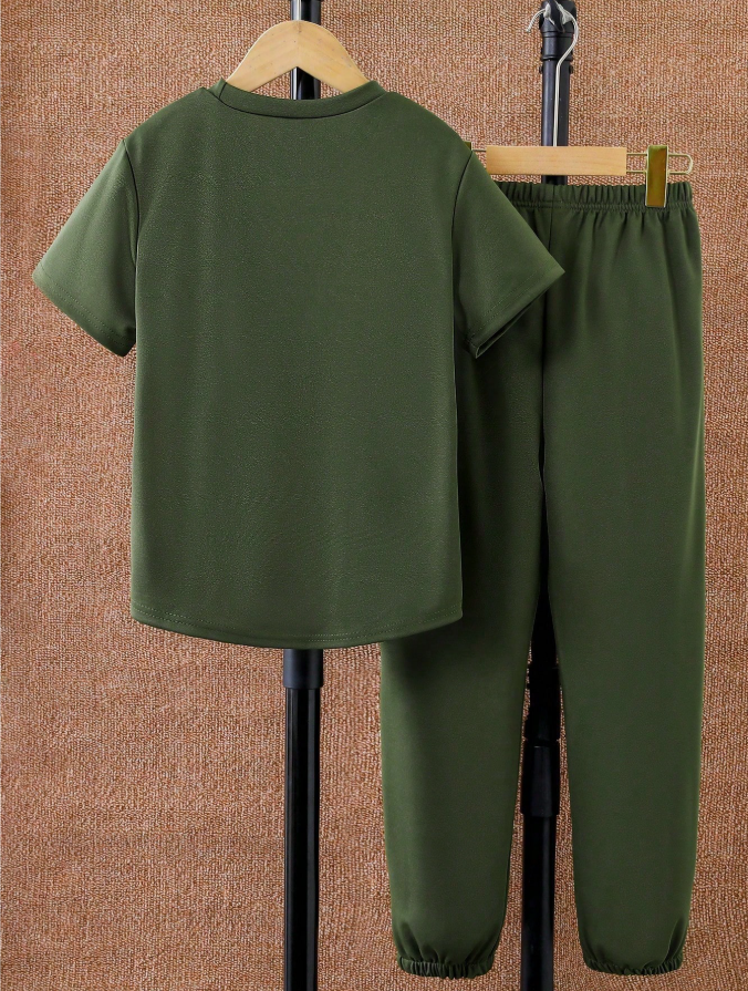 Bu kıyafet, modern sokak giyim tarzıyla günlük rahatlığı sağlamak üzere tasarlanmış, sade ve şık bir takımdır. Yumuşak, yuvarlak yakalı, kısa kollu, sade baskılı bir üst ve rahat uzun pantolondan oluşan bu takım, aktif erkek çocuklar için rahat ama şık bir görünüm sunar. Nefes alabilen, hafif ve cilt dostu kumaştan üretilen bu takım, gün boyu konfor ve kolay hareket imkanı sağlayarak okul, günlük geziler, oyun zamanı ve hafta sonu giyimi için mükemmeldir. Bu çok yönlü iki parçalı takım, pratikliği çağdaş stille birleştirerek, her ergen erkek çocuğunun gardırobuna olmazsa olmaz bir ektir.