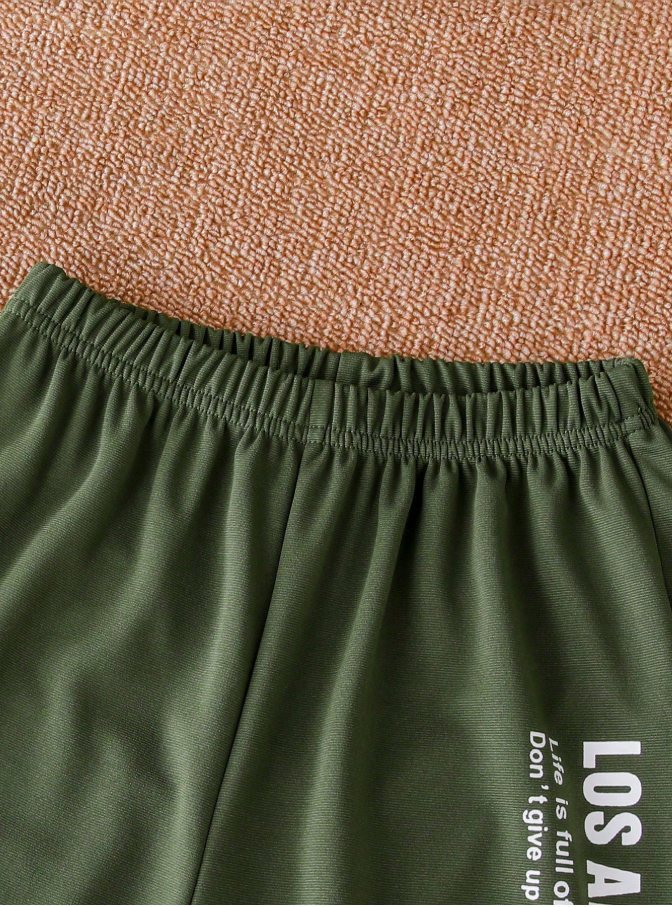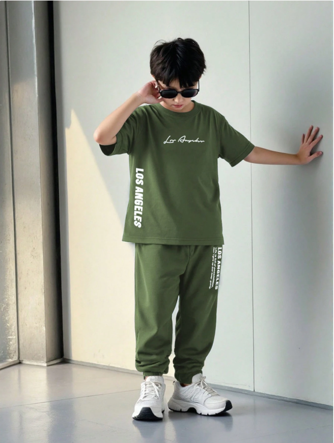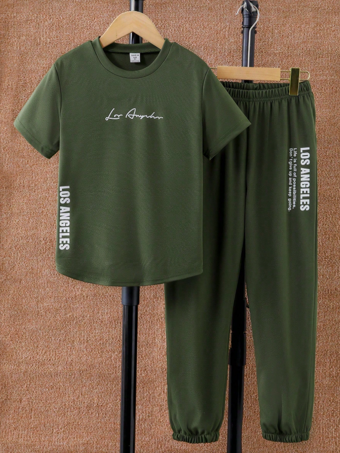 SHEIN Mirajuku Genç Erkek Çocuklar İçin Sade Baskılı Yuvarlak Yaka Kısa Kollu Üst ve Uzun Pantolon 2 Parça Takım