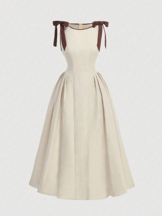 The SHEIN MOD Crew Neck Sleeveless Contrast Trim Bow Decor Waist Flare Hem Khaki Casual Dress offers a charming blend of playful details and classic silhouette, perfect for warm-weather outings. The contrast trim adds visual interest while the bow-decorated waist creates a flattering focal point, leading to a graceful flare hem that moves beautifully with every step.