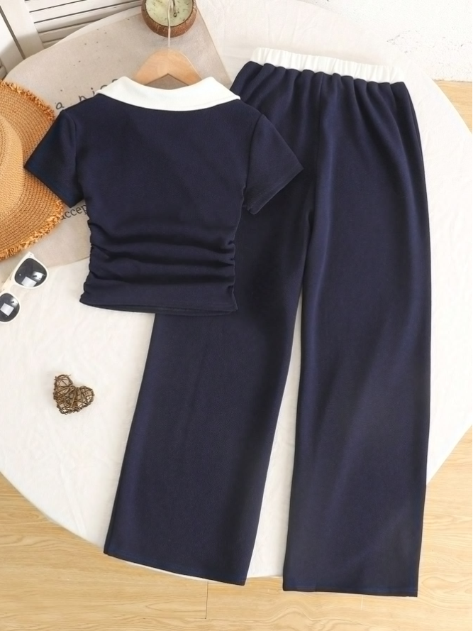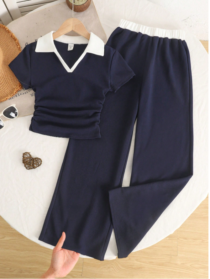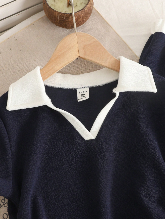 SHEIN Genç Kız Çocukları İçin Günlük Minimalist Polo Yaka Renk Bloklu Tişört ve Pantolon Takımı, günlük kullanım için tasarlanmış rahat ve şık bir okul kıyafetidir. Bu takım, klasik polo yakalı lacivert renk bloklu kısa kollu bir tişört ve ona uygun günlük pantolondan oluşarak derli toplu ve uyumlu bir görünüm sunar. Yumuşak, nefes alabilen kumaştan üretilen ve rahat bir kesime sahip olan bu takım, okul, aktiviteler ve günlük geziler için gün boyu konfor ve kolay hareket imkanı sağlar. Sade, minimalist tasarımı ve şık görünümüyle bu iki parçalı takım, genç kızların kendinden emin ve derli toplu görünmelerini sağlarken, geleneksel okul üniformalarına pratik ve modaya uygun bir alternatif sunar.