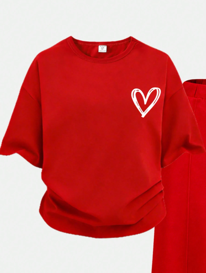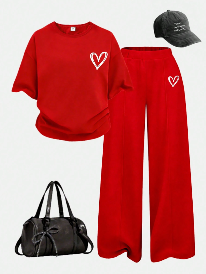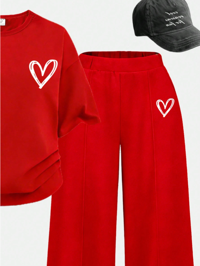 Genç Kızlar İçin İlkbahar ve Yaz Günlük Giyim Kalp Desenli Tişört ve Düz Paça Pantolon Takımı, rahatlık ve modern minimalist moda için tasarlanmış, taze ve şık bir günlük kıyafet. Yaratıcı kalp desenli baskılı rahat kısa kollu tişört, neşeli ve çağdaş bir his veren, zarif ama kişiselleştirilmiş bir estetik sunuyor. Klasik düz paça pantolonla eşleştirilen takım, hem şık hem de giymesi kolay, temiz ve dengeli bir silüet sunuyor. Hafif ve nefes alabilen kumaştan üretilen bu takım, sıcak ilkbahar ve yaz günlerinde tüm gün konfor sağlıyor. Okul, geziler, gündelik buluşmalar, seyahat ve günlük giyim için mükemmel olan bu çok yönlü iki parçalı takım, genç kızlar için zahmetsiz stil, rahatlık ve gençlik cazibesini bir araya getiriyor.