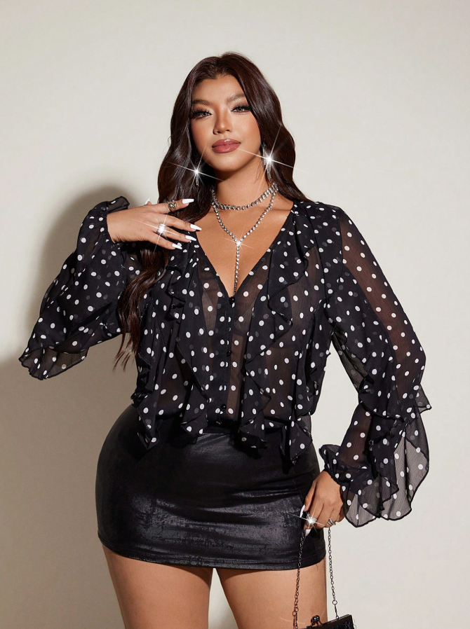 Embrace timeless charm with this Viva Relle plus size polka dot print blouse, featuring delicate ruffle trim that adds a playful, feminine touch to any outfit. The sheer, lightweight fabric creates an elegant, breathable layering piece that flatters curves while maintaining a sophisticated, sexy appeal. Versatile enough for both casual days and evening events, it pairs beautifully with camisoles or worn alone for a bolder look. This essential blouse celebrates curves with graceful, dotted elegance.